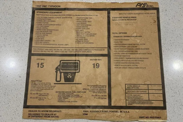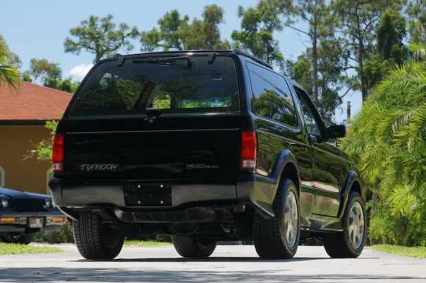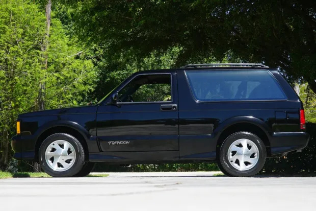 This 1992 GMC Typhoon is one of 2,497 examples produced for the model year and was delivered new to Gene Norris Oldsmobile-GMC of Middleburg Heights, Ohio. It remained registered in the state prior to the selling dealer’s acquisition in February 2022. Finished in black over matching leather, power is provided by a turbocharged and intercooled 4.3-liter V6 paired with a replacement four-speed automatic transmission. Equipment includes an all-wheel-drive system, a limited-slip differential, aerodynamic body fairings, a roof rack, 16″ wheels, air conditioning, and an AM/FM/CD stereo. Awesome Stuff