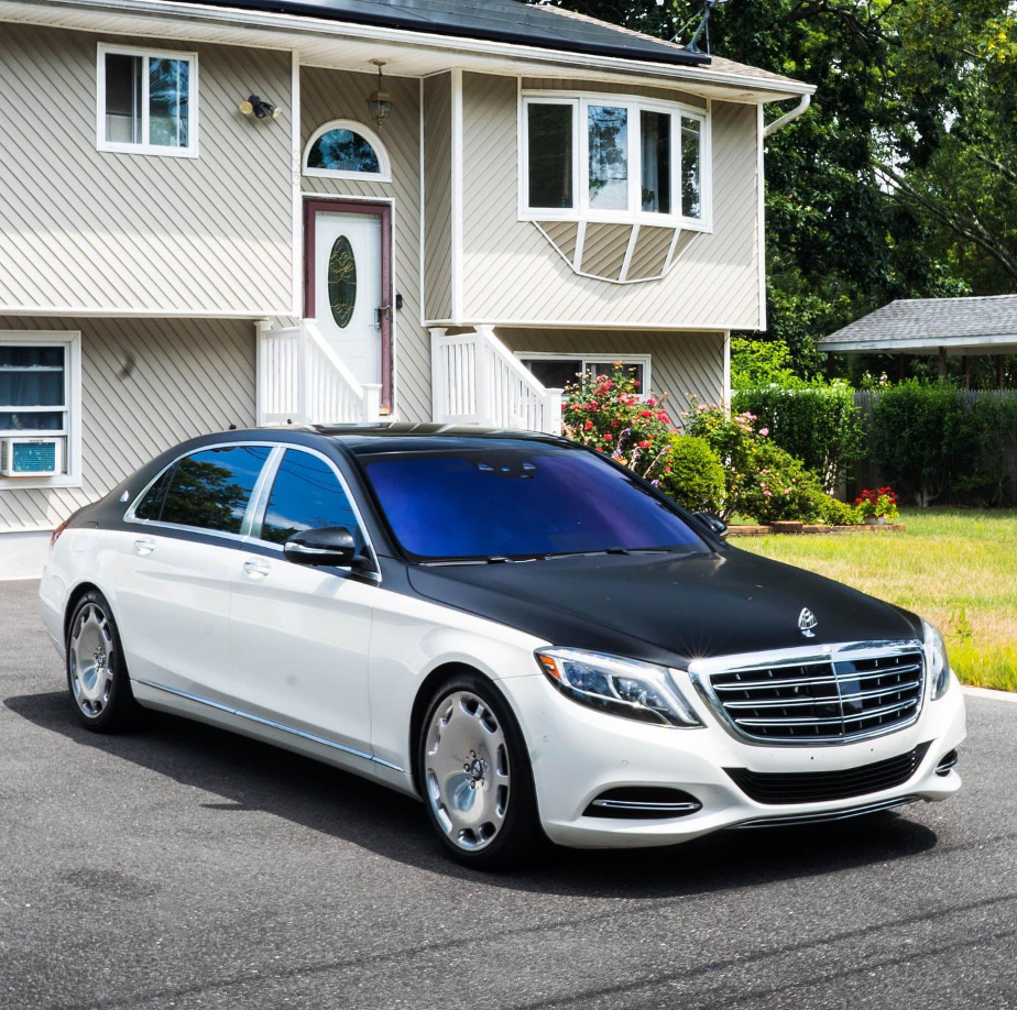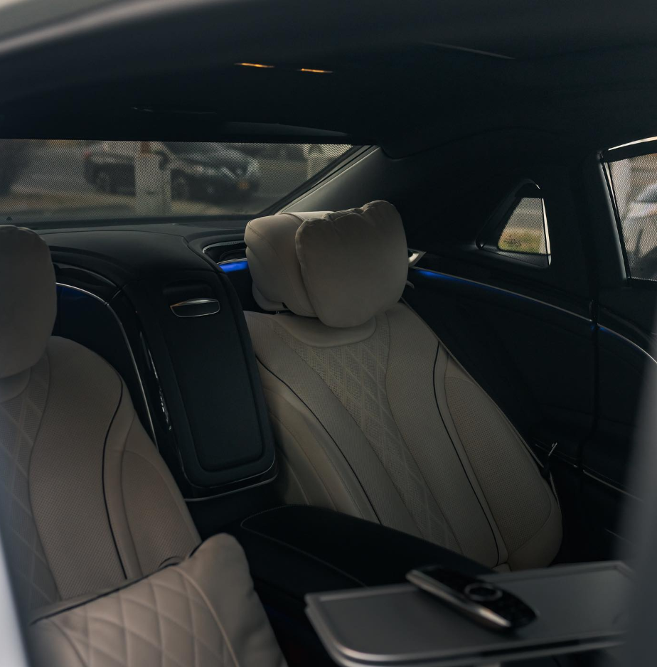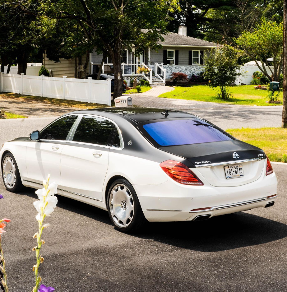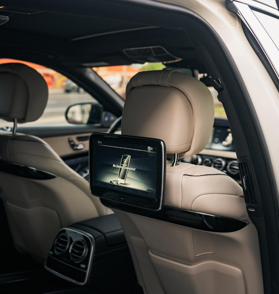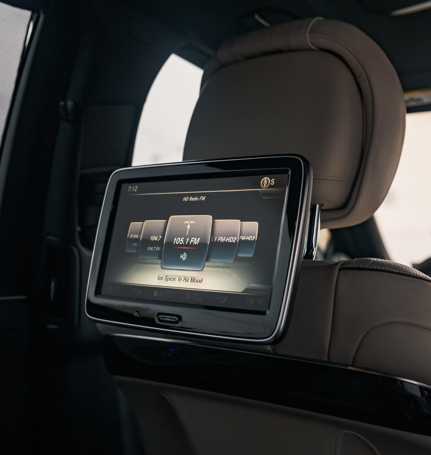Two-tone black and white exterior with a beige interior. Rear massaging, cooled, and heated seats with TV’s.