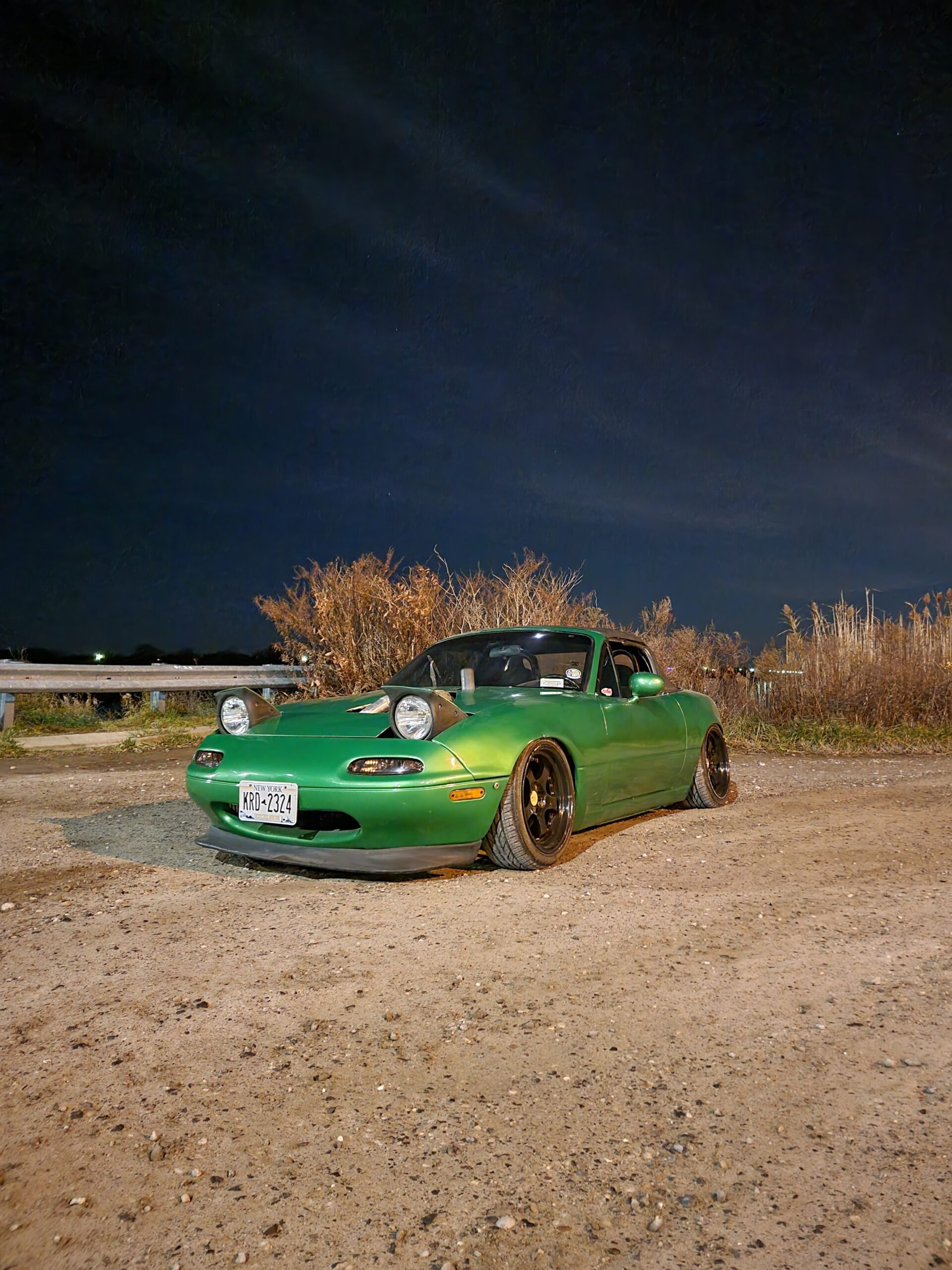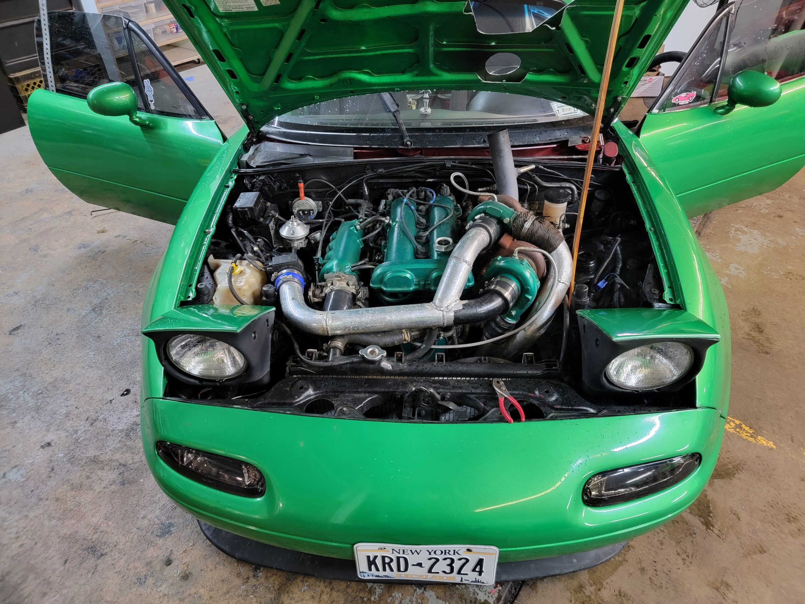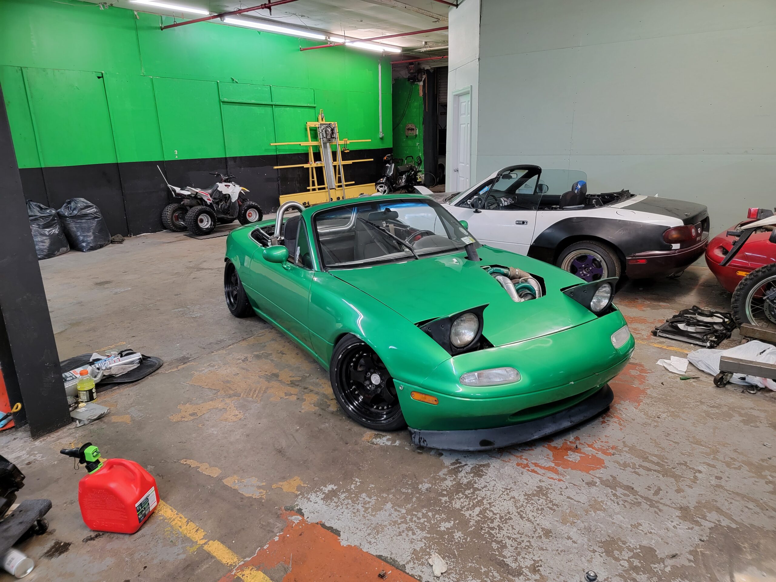 5 speed twin turbo miata exhaust out the hood and cut up hood. Paint is not the best. Very very low